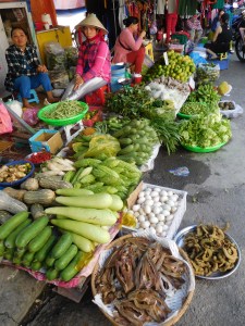 My favorite things in one day! First, a visit to an enormous food market, with every kind of fish/seafood and then every kind of fruit and vegetable. Really fun! First, all the fish are still alive, including the eels and yes, the frogs. Shrimp actually jumped out of their container. We walked past baskets of snails and cockles, moved on to tables of every part of the pig, saw some very dispirited chickens (they knew their time had come), and perused the wares of dozens of vendors of vegetables and fruits. We even saw one of kitchen staff from our boat buying custard apples and snakehead fish.