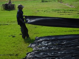 The next adventure involved a bicycle rickshaw ride through a small town. These rickshaws are for only one passenger and that passenger needs to have a decent sense of balance, but it was great to see the town at a slow pace. We stopped at a silk weaving factory – family-owned and weaving simply beautiful fabric. It was fascinating watching these old machines weave in patterns and the factory workers’ sharp eyes and skilled hands smoothing and untangling tiny knots in the nearly-invisible silk threads. We walked a bit to another factory that specializes in a traditional silk-dying method that creates an extremely shiny black silk, using only a local berry as the dye. The fabric is dipped, squeezed and spread on the grass to dry – and the process is repeated 100 times – that’s one zero zero. The results are simply beautiful. The family has also started experimenting with other colors using all-natural local dyes.