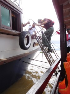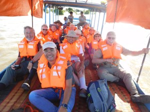 Getting from ship to barge (okay, these were maybe 30 feet by 9 feet with an outboard motor, a driver and a helper, with folding chairs lined up for us) was always an adventure. The small boat would tie up to the prow of the Toum Teav, our crew would lower a small ladder and over we would go – mid-canal, mid-lake, mid-river! No one ended up swimming and we even managed travel on a much smaller boat sitting on the floor and wearing our life jackets. The only hard part was getting up again.