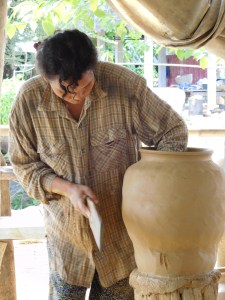 What a fascinating day! We left the Toum Teav early to explore two small family enterprises in Kampong Chhnang village – pottery and palm sugar “factories”.  The clay is dug out of the nearby mountain and we visited with a remarkable woman who creates beautiful pots and other items for sale from this clay. The only mechanical help is a fan. She shapes everything by hand – she is the potter’s wheel, circling the lump of clay and shaping it with a flat paddle and her skill. The pieces are dried by the sun and then in a fire, not a kiln. She sells a large pot for $1.15 to the wholesalers. She begins work about 4 AM every day and works until after dark, using a headlamp for light when needed while her husband mines the clay. They consider that they are doing well – there is a bathroom now, a good pump and electricity. The children can go to school She has a roof and ceiling fans in her work area, a beautiful smile and justifiable pride.